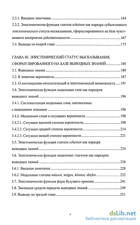 В третьей главе исследуются особенности актуализации основанного на выводных знаниях семантики эпистемического статуса высказывания, роль выводных знаний с точки зрения суждений и ситуаций, лежащих в основе этих знаний, а также иллокутивной силы высказывания, анализируются понятие вероятности, соотношение онтологической и эпистемической возможности, актуализация разной степени вероятности, получаемая через МС, эпистемическая функция МГ miissen, кбппеп, mogen, durfen, форм будущего времени, глагола scheinen. Помимо этого, анализируются контекстно-семантические особенности употребления языковых единиц, маркирующих субъективный эпистемический статус высказывания рассматриваемого типа в типичных коммуникативных ситуациях. В этой главе изучаются также вопросы, связанные с эволюцией отдельных маркеров эпистемической семантики.