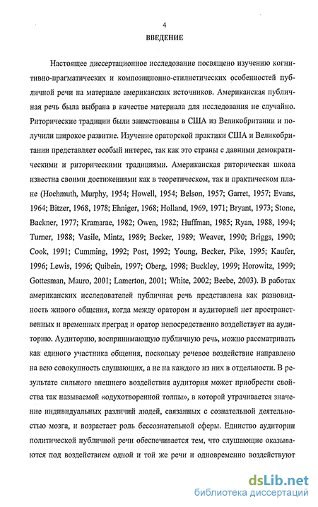 Настоящее диссертационное исследование посвящено изучению когнитивно-прагматических и композиционно-стилистических особенностей публичной речи на материале американских источников. Американская публичная речь была выбрана в качестве материала для исследования не случайно. Риторические традиции были заимствованы в США из Великобритании и получили широкое развитие. Изучение ораторской практики США и Великобритании представляет особый интерес, так как это страны с давними демократическими и риторическими традициями. Американская риторическая школа известна своими достижениями как в теоретическом, так и практическом плане (Hochmuth, Murphy, 1954; Howell, 1954; Belson, 1957; Garret, 1957; Evans, 1964; Bitzer, 1968, 1978; Ehniger, 1968; Holland, 1969, 1971; Bryant, 1973; Stone, Backner, 1977; Kramarae, 1982; Owen, 1982; Huffman, 1985; Ryan, 1988, 1994; Turner, 1988; Vasile, Mintz, 1989; Becker, 1989; Weaver, 1990; Briggs, 1990; Cook, 1991; Cumming, 1992; Post, 1992; Young, Becker, Pike, 1995; Kaufer, 1996; Lewis, 1996; Quibein, 1997; Oberg, 1998; Buckley, 1999; Horowitz, 1999; Gottesman, Mauro, 2001; Lamerton, 2001; White, 2002; Beebe, 2003). В работах американских исследователей публичная речь представлена как разновидность живого общения, когда между оратором и аудиторией нет пространственных и временных преград и оратор непосредственно воздействует на аудиторию. Аудиторию, воспринимающую публичную речь, можно рассматривать как единого участника общения, поскольку речевое воздействие направлено на всю совокупность слушающих, а не на каждого из них в отдельности. В результате сильного внешнего воздействия аудитория может приобрести свойства так называемой «одухотворенной толпы», в которой утрачивается значение индивидуальных различий людей, связанных с сознательной деятельностью мозга, и возрастает роль бессознательной сферы. Единство аудитории политической публичной речи обеспечивается тем, что слушающие оказываются под воздействием одной и той же речи и одновременно воздействуют