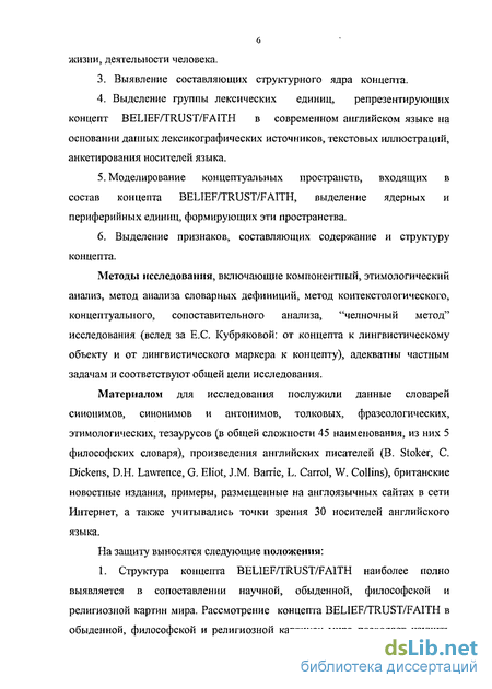 В качестве объекта исследования выступают лингвистические средства репрезентации концепта BELIEF/TRUST/FAITH в английском языке. Однако исследование не ограничивается словами belief, trust, faith, изучаются синонимические ряды этих единиц, рассматриваются их речевые употребления.