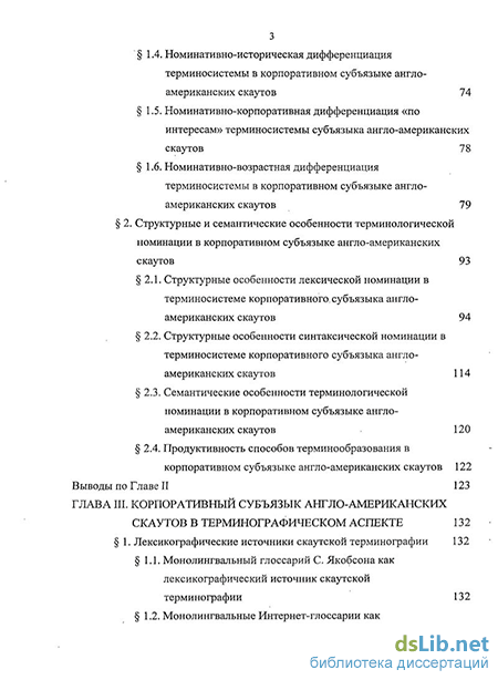 Во второй главе «Корпоративный субъязык англо-американских скаутов в номинативном аспекте», состоящей из двух разделов (1. Социолингвистические особенности терминологической номинации в корпоративном субъязыке англо-американских скаутов; 2. Структурные и семантические особенности терминологической номинации в корпоративном субъязыке англо-американских скаутов) рассматриваются особенности терминологической номинации в субъязыке британских и американских скаутов обозначенного исторического периода его существования в трех аспектах, присущих функционированию лексических систем и их единиц любого субъязыка: 1) социолингвистическом, 2) структурном и 3) семантическом.