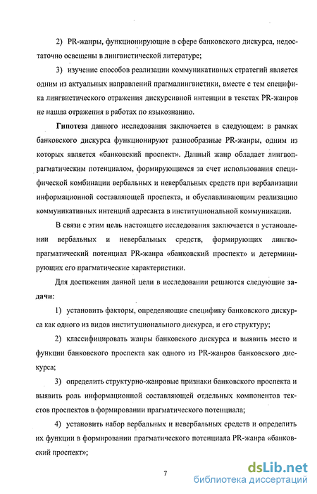 Гипотеза данного исследования заключается в следующем: в рамках банковского дискурса функционируют разнообразные PR-жанры, одним из которых является «банковский проспект». Данный жанр обладает лингвоп-рагматическим потенциалом, формирующимся за счет использования специфической комбинации вербальных и невербальных средств при вербализации информационной составляющей проспекта, и обуславливающим реализацию коммуникативных интенций адресанта в институциональной коммуникации.