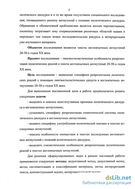 Предмет исследования - лингвостилистические особенности репрезентации политических реалий1 в тексте англоязычных антиутопий 20-50-х годов XX века.
