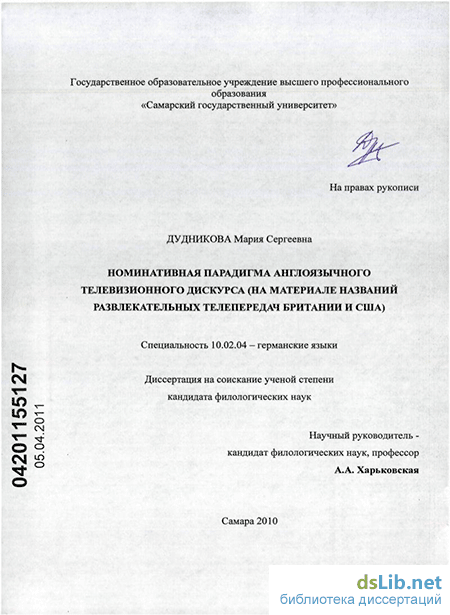 Реферируемая диссертационная работа посвящена исследованию телевизионного дискурсивного пространства в рамках сравнительного анализа названий развлекательных телепередач Британии и США и построению номинативной парадигмы англоязычного развлекательного телевизионного дискурса.
