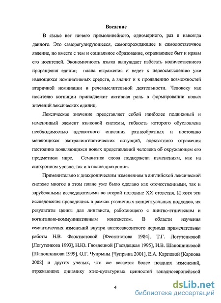 Применительно к диахроническим изменениям в английской лексической системе многое в этом плане уже было сделано как отечественными, так и зарубежными исследователями во второй половине XX столетия. И хотя эти исследования проводились в рамках различных концептуальных подходов, их результаты ценны для лингвиста, работающего с лингво-этническим и когнитивно-коммуникативным контекстом. В области изучения семантических изменений внутри англосаксонского периода примечательны работы Н.В. Феоктистовой [Феоктистова 1984], Т.Г. Логутенковой [Логутенкова 1993], Н.Ю. Гвоздецкой [Гвоздецкая 1995], И.В. Шапошниковой [Шапошникова 1999], О.Г. Чупрыны [Чупрына2001], Е.А. Карповой [Карпова 2002] и других ученых, что же касается более поздних изменений, отражающих динамику этно-культурных ценностей западноевропейской