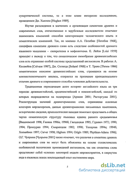 Традиционная периодизация делит историю английского языка на три периода: древнеанглийский, среднеанглийский и новоанглийский, каждый из которых подразделяется на подпериоды [Аракин 2001; Расторгуева 2001]. Реконструкция значений древнегерманских слов, отражавшая основные категории мировоззрения, данные древнегерманских письменных памятников, исторические сведения, археологические находки помогают представить в общих чертах семантическую структуру языковых единиц раннего средневековья [Вишневский 1998; Галина 1996а; 19966; Гвоздецкая 1995; Гуревич 1972; 1990; 1994; Проскурин 1994; Смирницкая 1982; 1998; Топорова 1994а; 19946; Хопияйнен 1997; Carver 1998; Higham 1994; Origin 1989; Phythian-Adams 1996]. О.Г. Чупрына [Чупрына 2001] также отмечает, что различия в семантике древних и современных слов не могут быть объяснены на основе стилистических особенностей поэтических произведений англосаксов, так как семантика слова представляет собой «слепок» некоторой модели мировосприятия, в свернутом виде в языковых знаках воплощающей опыт постижения мира.