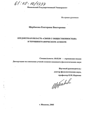Итак, сочетание лингвистического подхода к рассмотрению особенностей профессионально ориентированных языков, предложенного в работе З.И. Комаровой, с подходом к изучению терминологии К.Я. Авербуха позволит нам получить наиболее полное, актуальное представление о терминологии предметной области «связи с общественностью».