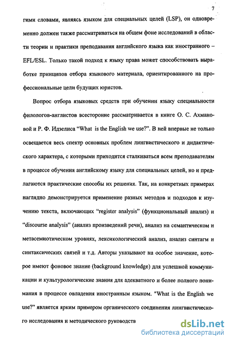 Вопрос отбора языковых средств при обучении языку специальности филологов-англистов всесторонне рассматривается в книге О. С. Ахмано-вой и Р. Ф. Идзелиса "What is the English we use?". В ней впервые не только освещается весь спектр основных проблем лингвистического и дидактического характера, с которыми приходится сталкиваться всем преподавателям в процессе обучения английскому языку для специальных целей, но и предлагаются практические способы их решения. Так, на конкретных примерах наглядно демонстрируется применение разных методов и подходов к изучению текста, включающих "register analysis" (функциональный анализ) и "discourse analysis" (анализ произведений речи), анализ на семантическом и метасемиотическом уровнях, лексикологический анализ, анализ синтагм и синтаксических связей и т.д. Авторы указывают на особое значение, которое имеют фоновое знание (background knowledge) для успешной коммуникации и культурологические знания для адекватного и более полного понимания в процессе овладения иностранным языком. "What is the English we use?" является ярким примером органического соединения лингвистического исследования и методического руководства по практической стилистике.