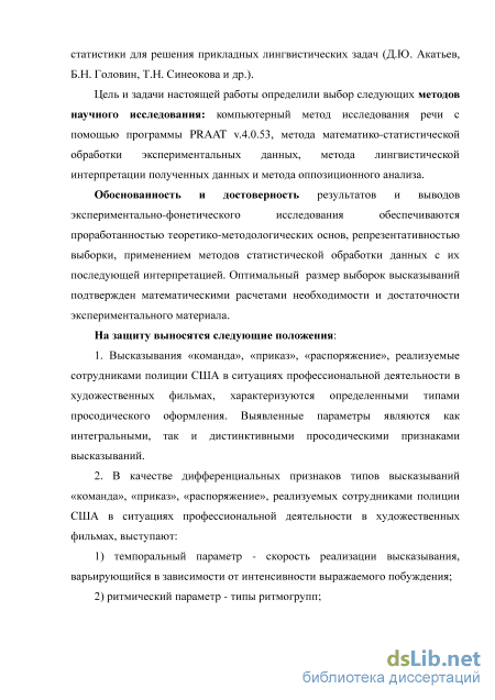 Целью данного диссертационного исследования является установление просодических признаков реализации «команд», «приказов» и «распоряжений» в речи сотрудников полиции США в художественных фильмах, определение их дифференциальных признаков и формирование списка критериев, позволяющих относить побудительные высказывания к одному из трех исследуемых типов на основании их просодических характеристик.