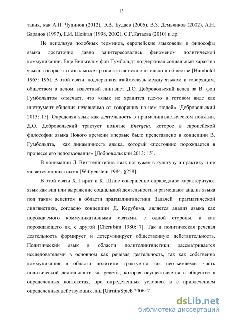 Не используя подобных терминов, европейские языковеды и философы языка достаточно давно заинтересовались феноменом политической коммуникации. Еще Вильгельм фон Гумбольдт подчеркивал социальный характер языка, говоря, что язык может развиваться исключительно в обществе [Humboldt 1963: 196]. В этой связи, подчеркивая взаймосвязь между языком и говорящим, обществом в целом, известный лингвист Д.О. Добровольский вслед за В. фон Гумбольдтом отмечает, что «язык не хранится где-то в готовом виде как инструмент общения независимо от говорящих на нем людей» [Добровольский 2013: 15]. Определяя язык как деятельность в прагмалингвистическом понятии, Д.О. Добровольский трактует понятие Energeia, которое в европейской философии языка Нового времени впервые было представлено в концепции В. Гумбольдта, как динамичность языка, который «постоянно порождается в процессе его использования» [Добровольский 2013: 15].