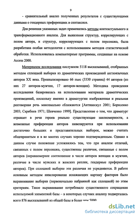 Материалом исследования послужили 5118 высказываний, отобранных методом сплошной выборки из драматических произведений англоязычных авторов XX века. Проанализировано 66 пьес (3330 страниц) 44 авторов (из них 27 авторов-мужчин, 17 авторов-женщин). Методика проведения исследования базировалась на использовании материала драматических произведений, поскольку именно в драматургии изображенная и реальная разговорная речь максимально сближаются [Антинескул 2001; Борисенко 2003; Скребнев 1971; Шевченко 1999]. Представление о том, что драматург отражает в речи героев реально существующие закономерности, а возможные преференции авторов нивелируются при использовании достаточно больших и представительных выборок, можно считать общепринятым и в во многих случаях хорошо подтвержденным. Однако в данном случае положение усложнялось тем, что при анализе отличий, связанных с полом персонажа, существенны различия, связанные с полом авторов (неравномерное соотношение в числе авторов женщин и мужчин, различие в числе мужских и женских реплик, гендерные преференции авторов). При сплошной выборке эти различия не усредняются. В работе основным методом нивелирования искажающих картину факторов было выравнивание выборки (первоначально набранной как сплошной) по этим критериям. Такое выравнивание потребовало существенного сокращения используемой элементной базы - в некоторых случаях анализу подвергались всего 876 высказываний из общей базы в более чем 5000.