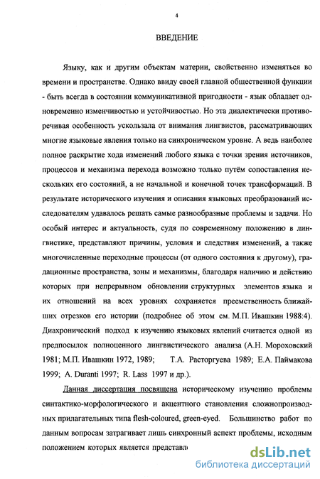 Современная англистика располагает рядом исследований в области семантического, морфологического и акцентного изучения сложнопроизвод-ных прилагательных (П.М. Каращук 1977; И.С. Торопцев 1980; Л.И. Темро-кова 1981; Н.М. Филиппова 1981; О.А. Габ 1981; Н.В. Квавртыч 1982; О. А. Габриэльян 1982; СТ. Адамова 1984; И.К. Архипов 1984; М.А. Соколова, К.П. Гинтовт и др. 1984; П.В. Царёв 1984; О.Д. Мешков 1985; 1986; Э.Я. Мороховская 1985; Е.С. Кубрякова 1988; 1990; Т.В. Колосова 1990; О.П. Ермакова, Е.А. Земская 1991; Е.Г. Белявская 1992; Р.З. Мурясов 1993; И.Б. Хлебникова 1994; О.В. Афанасьева 1994; И.Г. Ищенко 1995; О.А. Косенко 1995; Н.А. Лукьянова 1996; А.Г. Шавро 1997; Т.Ф. Мудрая 1998; И.А. Мельчук 1998; D. Abercrombie 1980; R.W. Burchfield 1985; H.A. Bruce 1985; О. Archangel, D. Pulleyblank 1994; L. Burzio 1994; J. Laver 1994; 1997; D. Leben 1995; A. Radford 1997; J. Fikkert 1997 и другие). Но объяснение лингвистических фактов по исследуемой проблеме в большинстве случаев ограничено недостаточной изученностью многих конкретных вопросов на историческом материале. Такое положение объясняется, среди прочих причин, наблюдающимся в последние десятилетия значительным креном в сторону синхронного описания (это относится не только к чисто структура-листическим работам, для которых всегда был характерен ярко выраженный антиисторизм, но и к новейшим направлениям - контрастивной лингвистике, лингвистике текста, коммуникативному синтаксису, социолингвистике, психолингвистике, трансформационной грамматике), вследствие чего диахронический аспект отошёл на задний план. А ведь вне исторического подхода невозможно решение не только многих частных вопросов синхронической лингвистики, но и ряда важнейших проблем общеязыковедческого характера.