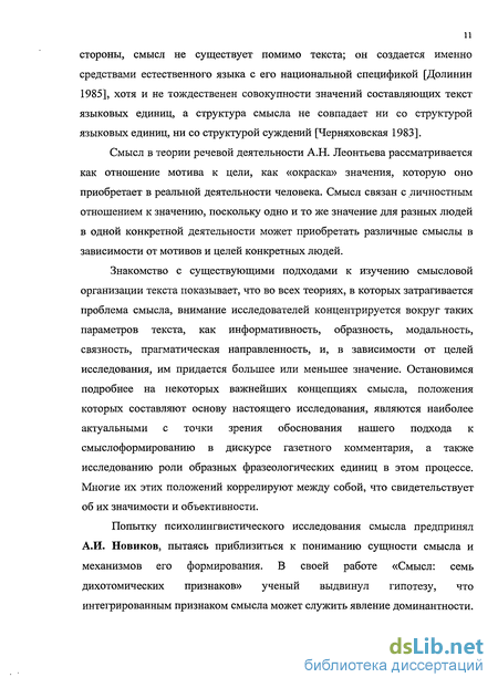 Знакомство с существующими подходами к изучению смысловой организации текста показывает, что во всех теориях, в которых затрагивается проблема смысла, внимание исследователей концентрируется вокруг таких параметров текста, как информативность, образность, модальность, связность, прагматическая направленность, и, в зависимости от целей исследования, им придается большее или меньшее значение. Остановимся подробнее на некоторых важнейших концепциях смысла, положения которых составляют основу настоящего исследования, являются наиболее актуальными с точки зрения обоснования нашего подхода к смыслоформированию в дискурсе газетного комментария, а также исследованию роли образных фразеологических единиц в этом процессе. Многие их этих положений коррелируют между собой, что свидетельствует об их значимости и объективности.
