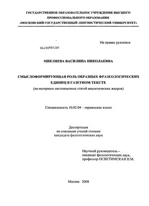 Настоящее диссертационное исследование посвящено изучению роли образных фразеологических единиц (ФЕ) в формировании смысла англоязычного газетного дискурса.