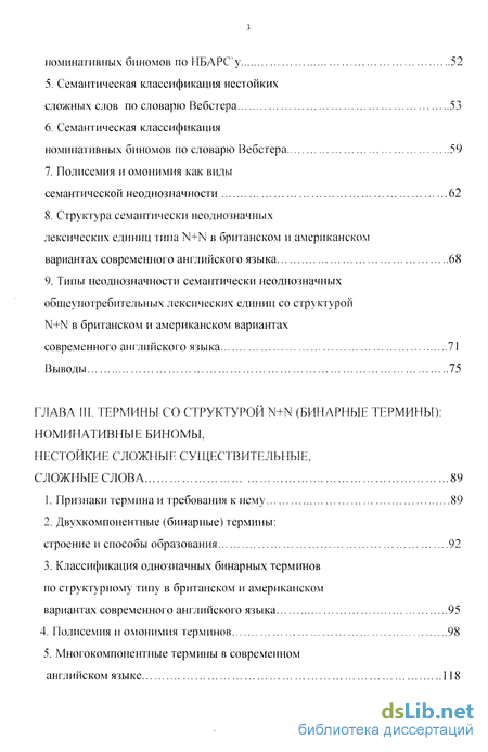 В третьей главе описывается структура терминов со структурой N+N по НБАРСу и словарю Вебстера, исследуется явление полисемии и омонимии