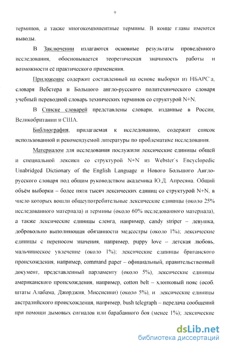 Материалом для исследования послужили лексические единицы общей и специальной лексики со структурой N+N из Webster's Encyclopedic Unabridged Dictionary of the English Language и Нового Большого Англорусского словаря под общим руководством академика Ю.Д, Апресяна. Общий объём выборки - более пяти тысяч лексических единиц со структурой N+N, в число которых вошли общеупотребительные лексические единицы (около 25% исследованного материала) и термины (около 60% исследованного материала), а также лексические единицы сленга, например, candy striper - девушка, добровольно выполняющая обязанности медсестры (около 1%); лексические единицы с переносом значения, например, puppy love - детская любовь, мальчишеское увлечение (около 1%); лексические единицы британского происхождения, например, command paper - официальный, правительственный документ, представленный парламенту (около 5%), лексические единицы американского происхождения, например, cotton belt - хлопковый пояс (особ, штаты Алабама, Джорджия, Миссисипи) (около 5%), и лексические единицы австралийского происхождения, например, bush telegraph - передача сообщений при помощи дымовых сигналов или барабанного боя (менее 1%); лексические