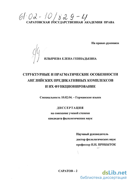 Ильичева Елена Геннадьевна. Структурные и прагматические особенности английских предикативных комплексов и их функционирование : диссертация ... кандидата филологических наук : 10.02.04.- Саратов, 2002.- 244 с.: ил. РГБ ОД, 61 02-10/829-4