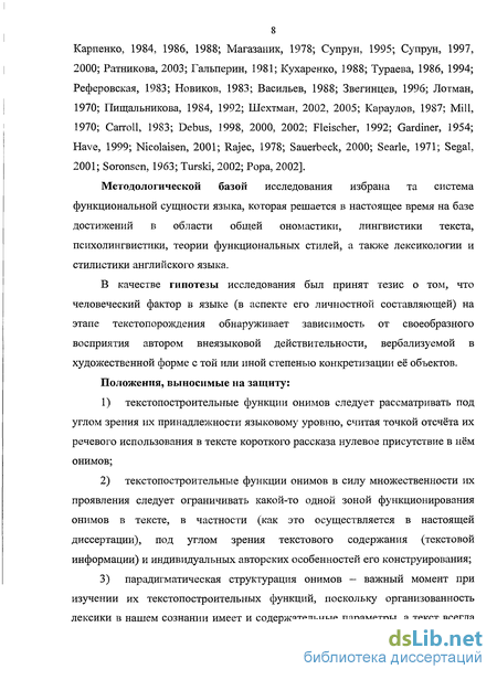 8 Карпенко, 1984, 1986, 1988; Магазаник, 1978; Супрун, 1995; Супрун, 1997, 2000; Ратникова, 2003; Гальперин, 1981; Кухаренко, 1988; Тураева, 1986, 1994; Реферовская, 1983; Новиков, 1983; Васильев, 1988; Звегинцев, 1996; Лотман, 1970; Пищальникова, 1984, 1992; Шехтман, 2002, 2005; Караулов, 1987; Mill, 1970; Carroll, 1983; Debus, 1998, 2000, 2002; Fleischer, 1992; Gardiner, 1954; Have, 1999; Nicolaisen, 2001; Rajec, 1978; Sauerbeck, 2000; Searle, 1971; Segal, 2001; Soronsen, 1963; Turski, 2002; Popa, 2002].