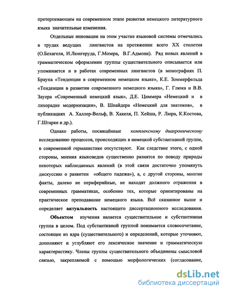 Однако работы, посвященные комплексному диахроническому исследованию процессов, происходящих в немецкой субстантивной группе, в современной германистике отсутствуют. Как следствие этого, с одной стороны, мнения языковедов существенно разнятся по поводу природы некоторых наблюдаемых явлений (в этой связи достаточно упомянуть дискуссию о развитии «общего падежа»), а, с другой стороны, многие факты, далеко не периферийные, не находят должного отражения в современных грамматиках, особенно тех, которые ориентированы на практическое преподавание немецкого языка. Всё сказанное выше и определяет актуальность настоящего диссертационного исследования.