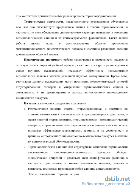 Научная новизна данного исследования обусловлена рассмотрением динамической природы термина сквозь призму лингвосинергетического подхода, а именно: функциональность термина впервые связывается с принципами самоорганизации семиотической системы в рамках англоязычного инновационно-технического дискурса. Новизной отмечается подход к описанию процессов, наблюдаемых в терминосистеме, в терминах теории динамического хаоса (точки бифуркации, периоды флуктуации, аттрактор) как средства достижения финальной или промежуточной упорядоченности. При этом поясняется механизм эффективного вхождения термина в терминосистему дисциплинарного дискурса, а за контекстом признается особая роль в процессе терминоформирования.