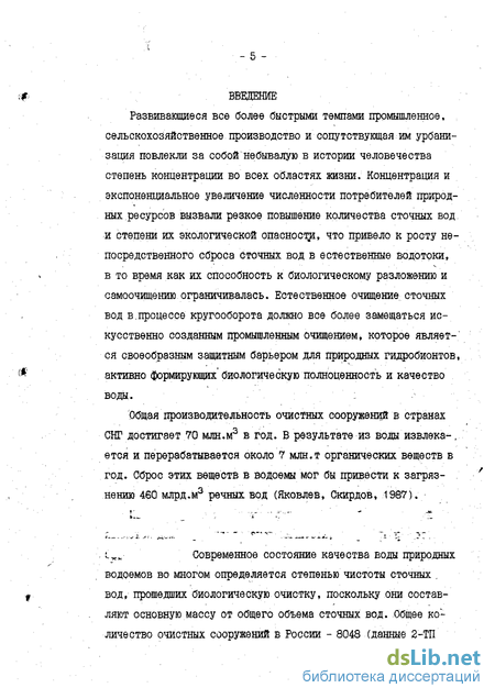 Развивающиеся все более быстрыми темпами промышленное, : сельскохозяйственное производство и сопутствующая им урбанизация повлекли за собой небывалую в истории человечества степень концентрации во всех областях жизни. Концентрация и экспоненциальное увеличение численности потребителей природных ресурсов вызвали резкое повышение количества сточных вод, и степени их экологической опасности, что привело к росту непосредственного сброса бточных вод в естественные водотоки, в то время как их способность к биологическому разложению и самоочищению ограничивалась. Естественное очищение сточных вод в,процессе кругооборота должно все более замещаться искусственно созданным промышленным очищением, которое являет- ся своеобразным защитным барьером для природных гидробионтов, активно формирующих биологическую полноценность и качество вода.