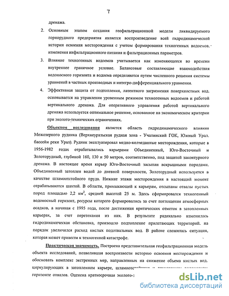 Объектом исследования является область гидродинамического влияния Межозерного рудника (Верхнеуральская рудная зона - Учалинский ГОК, Южный Урал, бассейн реки Урал). Рудник эксплуатировал медно-колчеданные месторождения, которые в 1956-1982 годах отрабатывались карьерами Объединенный, Юго-Восточный и Золоторудный, глубиной 160, 130 и 50 метров, соответственно, под защитой законтурного дренажа. В настоящее время карьер Юго-Восточный засыпан вскрышными породами. Объединенный затоплен водой до дневной поверхности, Золоторудный используется в качестве шламоотстойного пруда. Нижние этажи месторождения в настоящий момент отрабатываются шахтой. В области, примыкающей к карьерам, отсыпаны отвалы пустых пород площадью 2,2 км2, средней высотой 25 м. Здесь сформировался техногенный водоносный горизонт, ресурсы которого формировались за счет поглощения атмосферных осадков, а начиная с 1995 года, после достижения критических отметок в затопленных карьерах, за счет перетекания из них. В результате радикально изменилась гидродинамическая обстановка, произошло подтопление прилегающих территорий, на порядок увеличился расход кислых подотвальных вод. В районе сложилась ситуация, которая может привести к техногенной катастрофе.