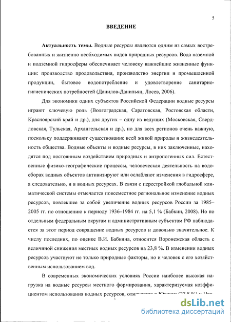 Актуальность темы. Водные ресурсы являются одним из самых востребованных и жизненно необходимых видов природных ресурсов. Естественные природные процессы и человеческая деятельность на водосборах водных объектов активизируют изменения в гидросфере, а следовательно, в количестве и качестве водных ресурсов. В связи с перестройкой глобальной климатической системы отмечается повсеместное региональное изменение водных ресурсов, повлекшее за собой увеличение водных ресурсов России за 1985-2005 гг. по отношению к периоду 1936-1984 гг. на 5,1 %. Но по отдельным административным территориям, в том числе по Воронежской области, наблюдается сокращение водных ресурсов за этот период. Величина снижения местных водных ресурсов, по оценке В.И. Бабкина (2008), составляет 23,8 %.