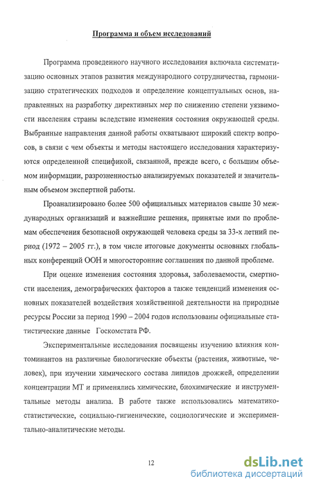 Экспериментальные исследования посвящены изучению влияния кон-томинантов на различные биологические объекты (растения, животные, человек), при изучении химического состава липидов дрожжей, определении концентрации МТ и применялись химические, биохимические и инструментальные методы анализа. В работе также использовались математико-статистические, социально-гигиенические, социологические и экспериментально-аналитические методы.