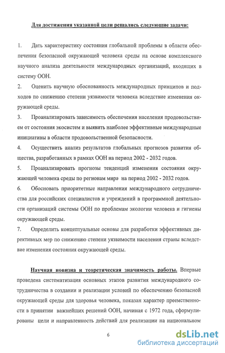 Научная новизна и теоретическая значимость работы. Впервые проведена систематизация основных этапов развития международного сотрудничества в создании и реализации условий по обеспечению безопасной окружающей среды для здоровья человека, показан характер преемственности в принятии важнейших решений ООН, начиная с 1972 года, сформулированы цели и направленность действий для реализации на национальном