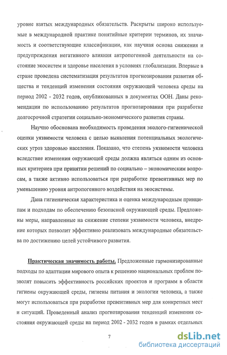 Практическая значимость работы. Предложенные гармонизированные подходы по адаптации мирового опыта к решению национальных проблем позволят повысить эффективность российских проектов и программ в области гигиены окружающей среды, гигиены питания и экологии человека, а также могут использоваться при разработке превентивных мер для конкретных мест и ситуаций. Проведенный анализ прогнозирования тенденций изменения состояния окружающей среды на период 2002 - 2032 годов в рамках отдельных