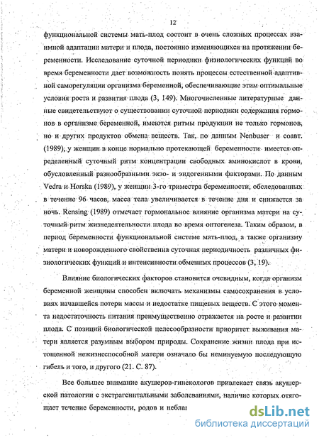Связь питания внутриутробного плода с исходным состоянием питания матери до зачатия и питания беременной женщины носит исключительно тесный и непростой характер. Так, если раньше была широко распространена точка зрения о способности плода «взять» все необходимые нутриенты от материнского организма независимо от его состояния и питания, то в настоящее время накоплено много фактов, позволяющих ограничить роль простого паразитизма. В условиях неблагоприятной пищевой обеспеченности и потери массы тела, организм беременной женщины способен включать мощные механизмы самосохранения и с этого периода недостаточность питания преимущественно отражается на развитии плода (21. С. 87).