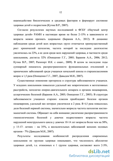 Согласно результатам научных исследований в ФГБУ «Научный центр здоровья детей» РАМН в настоящее время не более 2-15% в зависимости от возраста можно признать здоровыми (Баранов А.А., 2012). В динамике наблюдения среди детей всех возрастных групп отмечается преимущественный рост хронической патологии, частота которой за последнее десятилетие увеличилась на 22%, а ее доля среди всех нарушений здоровья, в частности среди школьников, достигла 32% (Онищенко Г.Г., 2005; Баранов А.А., 2006; 2012; Кучма В.Р., 2007; Рапопорт И.К. с соавт., 2009). В целом за последние годы суммарный показатель распространенности функциональных отклонений и хронических заболеваний среди учащихся начальной школы и старшеклассников возрос в 1,5 раза (Онищенко Г.Г., 2007; Давыдов М.И., 2007).
