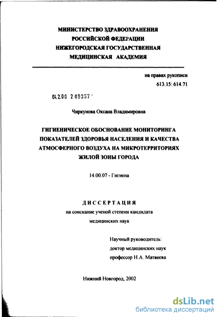 Чиркунова Оксана Владимировна. Гигиеническое обоснование мониторинга показателей здоровья населения и качества атмосферного воздуха на микротерриториях жилой зоны города : диссертация ... кандидата медицинских наук : 14.00.07 / Чиркунова Оксана Владимировна; [Место защиты: Нижегородская государственная медицинская академия].- Нижний Новгород, 2002.- 183 с.: ил.