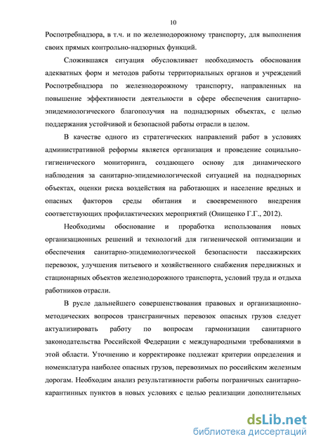 Степень разработанности темы исследования. Как известно, процесс реформирования железнодорожного транспорта сопровождается значительными социально-экономическими и структурными преобразованиями в отрасли. Это, в свою очередь, повлекло за собой определенные сложности в организации повседневной деятельности государственной санитарно-эпидемиологической службы МПС России. На определенном этапе указанные структуры были переданы в ведение Федеральной службы по надзору в сфере защиты прав потребителей и благополучия человека (Роспотребнадзор), причем с сохранением их основных функций, связанных с обеспечением санитарно-эпидемиологического благополучия на объектах железнодорожного транспорта и транспортной инфраструктуры.