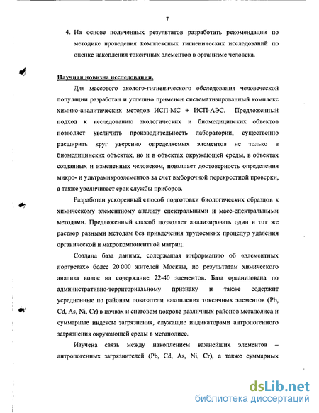 Однако в настоящее время такие современные методы элементного анализа, как атомно-эмиссионная спектрометрия с индуктивно-связанной плазмой (ИСП-АЭС) и масс-спектрометрия с индуктивно-связанной плазмой (ИСП-МС) практически не применяются в гигиенических исследованиях и мониторинге, что снижает эффективность комплексной гигиенической экспертизы медико-экологической ситуации в различных регионах РФ, и как следствие, тормозит шаги по внедрению социально-гигиенического мониторинга, предпринимаемые Минздравом и органами Госсанэпиднадзора РФ.