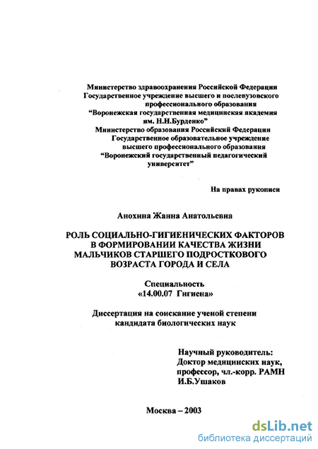 Анохина Жанна Анатольевна. Роль социально-гигиенических факторов в формировании качества жизни мальчиков старшего подросткового возраста города и села : диссертация ... кандидата биологических наук : 14.00.07.- Москва, 2003.- 136 с.: ил. РГБ ОД, 61 03-3/925-0