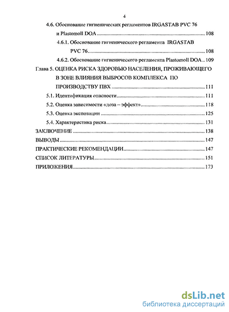 Личный вклад автора. Автором проведен сбор и анализ научной литературы по теме диссертации, составлен план и разработана программа токсиколого-гигиенических исследований по изучению токсичности и опасности антиоксиданта IRGASTAB PVC 76 и пластификатора Plastomoll DOA, а также проведена оценка риска здоровью населения, проживающего в зоне влияния производства поливинилхлорида. Автором лично организованы и проведены исследования по всем разделам работы. Самостоятельно проведена статистическая обработка, анализ и обобщение полученных результатов, внедрение их в практику. Доля участия автора в накоплении информации – 80%, в обработке результатов – 100%.