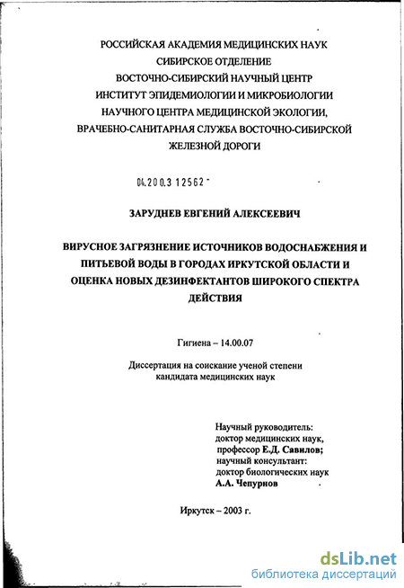 Заруднев Евгений Алексеевич. Вирусное загрязнение источников водоснабжения и питьевой воды в городах Иркутской обл. и оценка новых дезинфектантов широкого спектра действия : диссертация ... кандидата медицинских наук : 14.00.07 / Заруднев Евгений Алексеевич; [Место защиты: Федеральное государственное унитарное предприятие "Всероссийский научно-исследовательский институт железнодорожной гигиены"].- Москва, 2003.- 130 с.: ил.