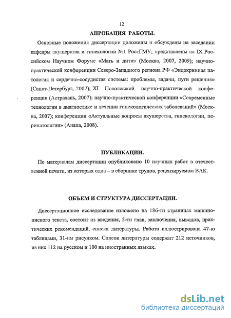 Основные положения диссертации доложены и обсуждены на заседании кафедры акушерства и гинекологии №1 РостГМУ; представлены на IX Российском Научном Форуме «Мать и дитя» (Москва, 2007, 2009); научно-практической конференции Северо-Западного региона РФ «Эндокринная патология и сердечно-сосудистая система: проблемы, задачи, пути решения» (Санкт-Петербург, 2007); XI Поволжской научно-практической конференции (Астрахань, 2007); научно-практической конференции «Современные технологии в диагностике и лечении гинекологических заболеваний» (Москва, 2007); конференции «Актуальные вопросы акушерства, гинекологии, перинатологии» (Анапа, 2008).