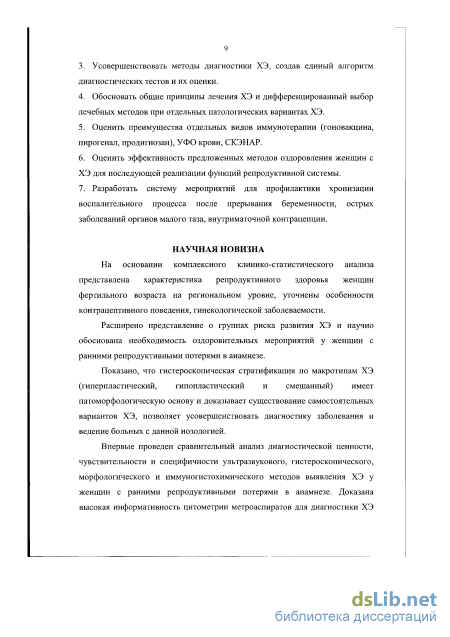 Впервые проведен сравнительный анализ диагностической ценности, чувствительности и специфичности ультразвукового, гистероскопического, морфологического и иммуногистохимического методов выявления ХЭ у женщин с ранними репродуктивными потерями в анамнезе. Доказана высокая информативность цитометрии метроаспиратов для диагностики ХЭ в послеабортном периоде, сопоставимая с диагностическими возможностями патоморфологического исследования эндометрия.