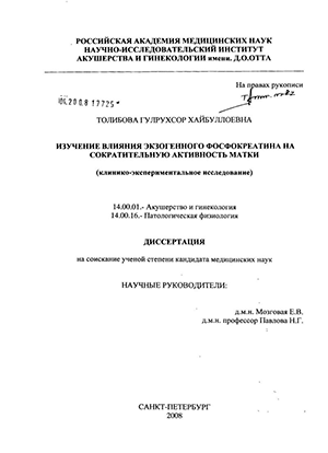 Показано, что действие экзогенного фосфокреатина, являющегося энергетическим субстратом маточного сокращения, обусловлено повышением уровня фосфокреатина в миоцитах, а именно в реакциях креатинкиназно-фосфокреатиновой системы миометрия.