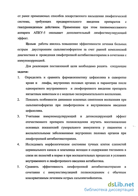 Целью работы явилось повышение эффективности лечения больных острым двусторонним сальпингоофоритом за счет ранней комплексной диагностики и проведения лимфотропной антибиотикотерапии в сочетании с иммунокоррекцией.