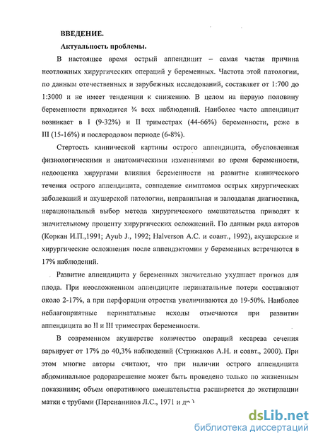 Стертость клинической картины острого аппендицита, обусловленная физиологическими и анатомическими изменениями во время беременности, недооценка хирургами влияния беременности на развитие клинического течения острого аппендицита, совпадение симптомов острых хирургических заболеваний и акушерской патологии, неправильная и запоздалая диагностика, нерациональный выбор метода хирургического вмешательства приводят к значительному проценту хирургических осложнений. По данным ряда авторов (Коркан И.П.,1991; Ayub J., 1992; Halverson А.С. и соавт., 1992), акушерские и хирургические осложнения после аппендэктомии у беременных встречаются в 17% наблюдений.