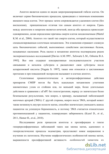 Развитие опухолевых новообразований - результат ускоренной клеточной пролиферации, опережающей тормозящий эффект апоптоза. Доказано, что апоптоз приостанавливается в миомах матки [127]. Основным гормоном, оказывающим решающее значение в формировании и росте миомы матки, является прогестерон. Прогестерон вызывает стремительное увеличение экспрессии bcl-2 (основной маркер подавления апоптоза) в клетках миомы, достигая максимальной концентрации bcl-2 в секреторную фазу. Эстрогены лишь незначительно влияют на концентрацию bcl-2. Следовательно, прогестерон способен влиять на рост миомы посредством блокирования апоптоза, что приводит к увеличению интервала жизни клетки. В нормальном миометрии чрезмерного образования bcl-2 в присутствии прогестерона не отмечено. Иммуногистохимические исследования показали, что до 90% клеток пролиферирующих лейомиом матки содержат активные рецепторы прогестерона [5,12,13,73,128].