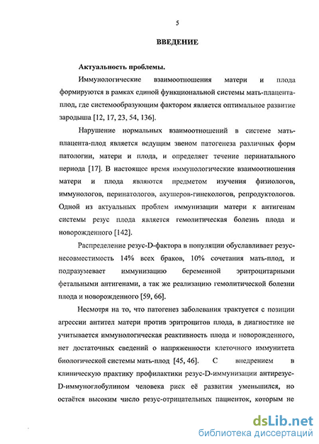 Иммунологические взаимоотношения матери и плода формируются в рамках единой функциональной системы, где системообразующим фактором является оптимальное развитие зародыша (С.И. Колесников, 1985; Н.Б. Найговзина, 1979; К.В. Шмагель, 2002; G. Malinvaud, 1975; M. Czeszynska, 1991). Нарушение целостности иммунобиологических взаимосвязей в системе мать-плацента-плод является ведущим звеном патогенеза различных форм патологии матери и плода, определяет течение перинатального периода (А.Г. Коноплянников, 2005; P. Gurevich, 1997). В настоящее время иммунологические взаимоотношения матери и плода являются предметом изучения физиологов, иммунологов, перинатологов, акушеров-гинекологов. В связи с этим одной из актуальных проблем иммунизации матери к антигенам системы резус плода является гемолитическая болезнь плода (ГБП) и новорожденного (ГБН) (В.И. Кулаков, 2005; А.В. Макогон, 2002; Л.И. Мальцева, 2006; В. Ю. Талаев, 1999; D.R. Bratlid, 2001; Oktay, 1996). В популяции встречаемость резус-несовместимых браков составляет 14%, резус-несовместимость в системе мать-плод - 10%, которая предполагает иммунизацию беременной женщины эритроцитарными фетальными антигенами и реализацию её в гемолитическую болезнь плода и новорожденного (Н.В. Минеева, 2002; В.А. Мороков, 1999). Несмотря на то, что патогенез заболевания трактуется с позиции агрессии антител матери против эритроцитов плода, в диагностике не учитывается иммунологическая реактивность плода и новорожденного, нет достаточных сведений о напряженности клеточного иммунитета организма резус-отрицательной матери при иммуноконфликтной беременности (Н.Н. Кеворков, 1979; И.А. Геворкян, 2005; Т.Г. Гоцадзе, 1990; О.Ю. Севостьянова, 1990). С внедрением в клиническую практику профилактики гемолитической болезни по резус-фактору антирезус-D-иммуноглобулином человека риск ее развития уменьшился, но остаётся высоким число резус-отрицательных пациенток, которым не разрешено проведение такой иммунопрофилактики, либо она является неэффективной (А.Г. Антонов, 2006; В. А. Мороков, 1988; B.van Dijk, 1997; J. Chilcott, 2004; R. Fox, 1998).