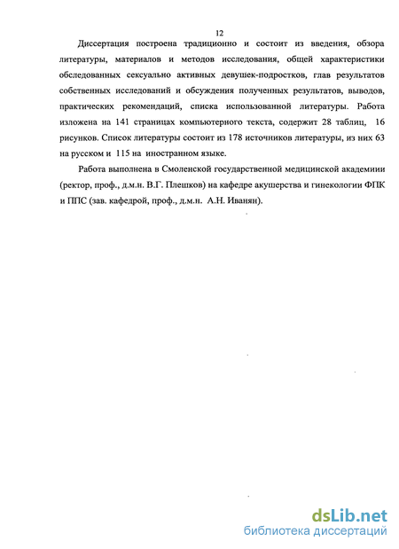 Диссертация построена традиционно и состоит из введения, обзора литературы, материалов и методов исследования, общей характеристики обследованных сексуально активных девуніек-подростков, глав результатов собственных исследований и обсуждения полученных результатов, выводов, практических рекомендаций, списка использованной литературы. Работа изложена на 141 страницах компьютерного текста, содержит 28 таблиц, 16 рисунков. Список литературы состоит из 178 источников литературы, из них 63 на русском и 115 на иностранном языке.