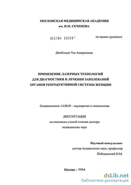 Джибладзе Теа Амирановна. Применение лазерных технологий для диагностики и лечения заболеваний органов репродуктивной системы женщин : диссертация ... доктора медицинских наук : 14.00.01 / Джибладзе Теа Амирановна; [Место защиты: Государственное образовательное учреждение высшего профессионального образования "Московская медицинская академия"].- Москва, 2004.- 268 с.: ил.