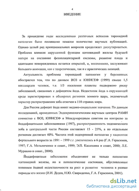 Актуальность темы. Появляется все больше сведений о достаточно большой распространенности зоба среди беременных, который наряду с нарушениями функции щитовидной железы может способствовать увеличению частоты осложнений гестации и родов, что определяет высокий риск перинатальной патологии (И.И. Дедов, и соавт., 2001; Л.Е. Мурашко и соавт., 2002; Е.А. Трошина и соавт., 2003; Н.Д. Фанченко и соавт., 2003; D.Glinoer et al., 2003; G.Weber et al., 2003).