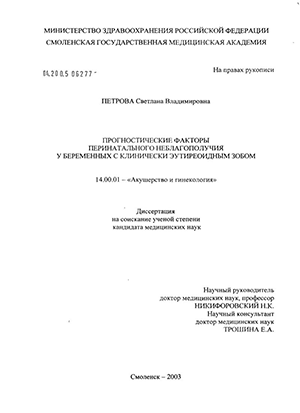 Апробация работы. Основные положения диссертации доложены и обсуждены на конференциях молодых ученых Смоленской государственной медицинской академии (2002, 2003), на заседании проблемной комиссии по материнству и детству Смоленской государственной медицинской академии (2002, 2003), Смоленской городской научно-практической конференции акушеров-гинекологов, педиатров и эндокринологов (2002), Смоленской областной конференции врачей акушеров-гинекологов (2002), Х(Х11) Российском симпозиуме «Современные аспекты хирургической эндокринологии» (Смоленск-Москва, 2002), XI Российском национальном конгрессе «Человек и лекарство» (Москва, 2002).