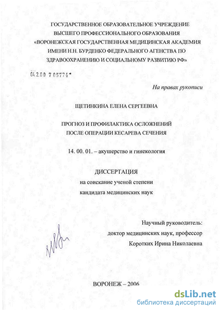 Щетинкина Елена Сергеевна. Прогноз и профилактика осложнений после операции кесарева сечения : диссертация ... кандидата медицинских наук : 14.00.01 / Щетинкина Елена Сергеевна; [Место защиты: ГОУВПО "Волгоградский государственный медицинский университет"].- Волгоград, 2006.- 0 с.: ил.