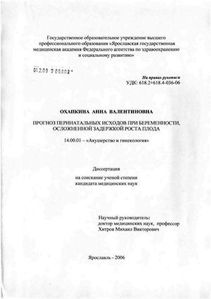 Основные положения проведенного исследования изложенные в диссертации опубликованы в журнале «АГ-инфо» (2006 г), центральном печатном органе Российского Общества акушеров-гинекологов «Журнал РОАГ» (2005 і ) доложены на VII и VIII Российских форумах «Мать и дитя» (Москва 2005 и 2006 гг ) на заседании Ярославской региональной организации РОАГ, па заседании кафедры акушерства и гинекологии Ярославской медицинской академии